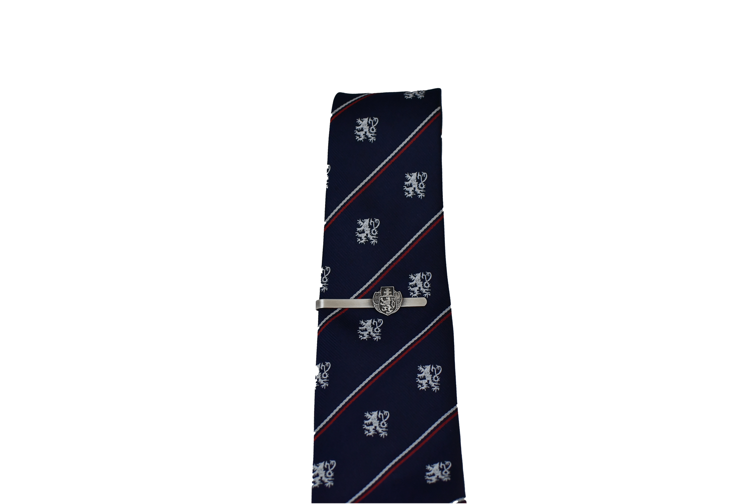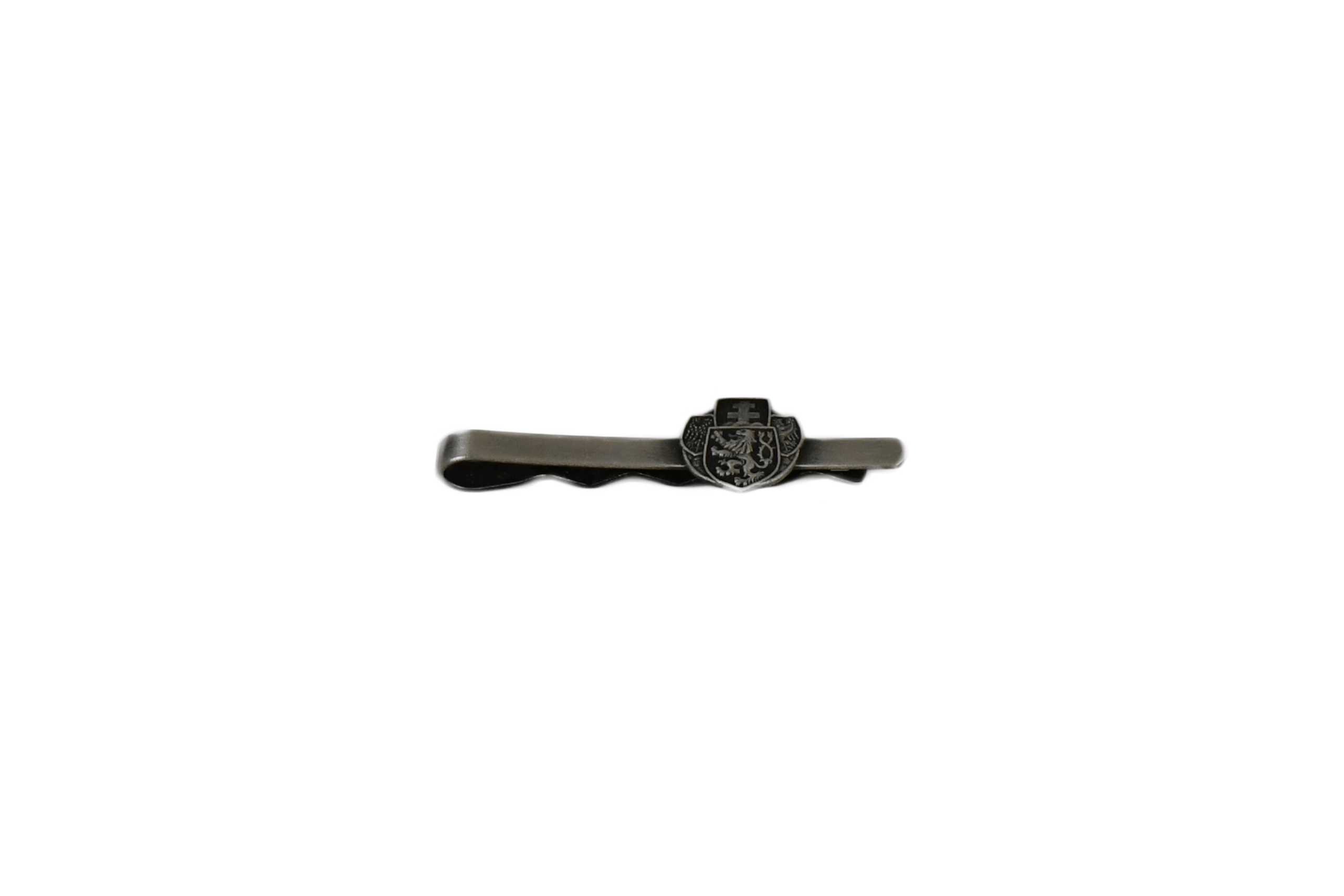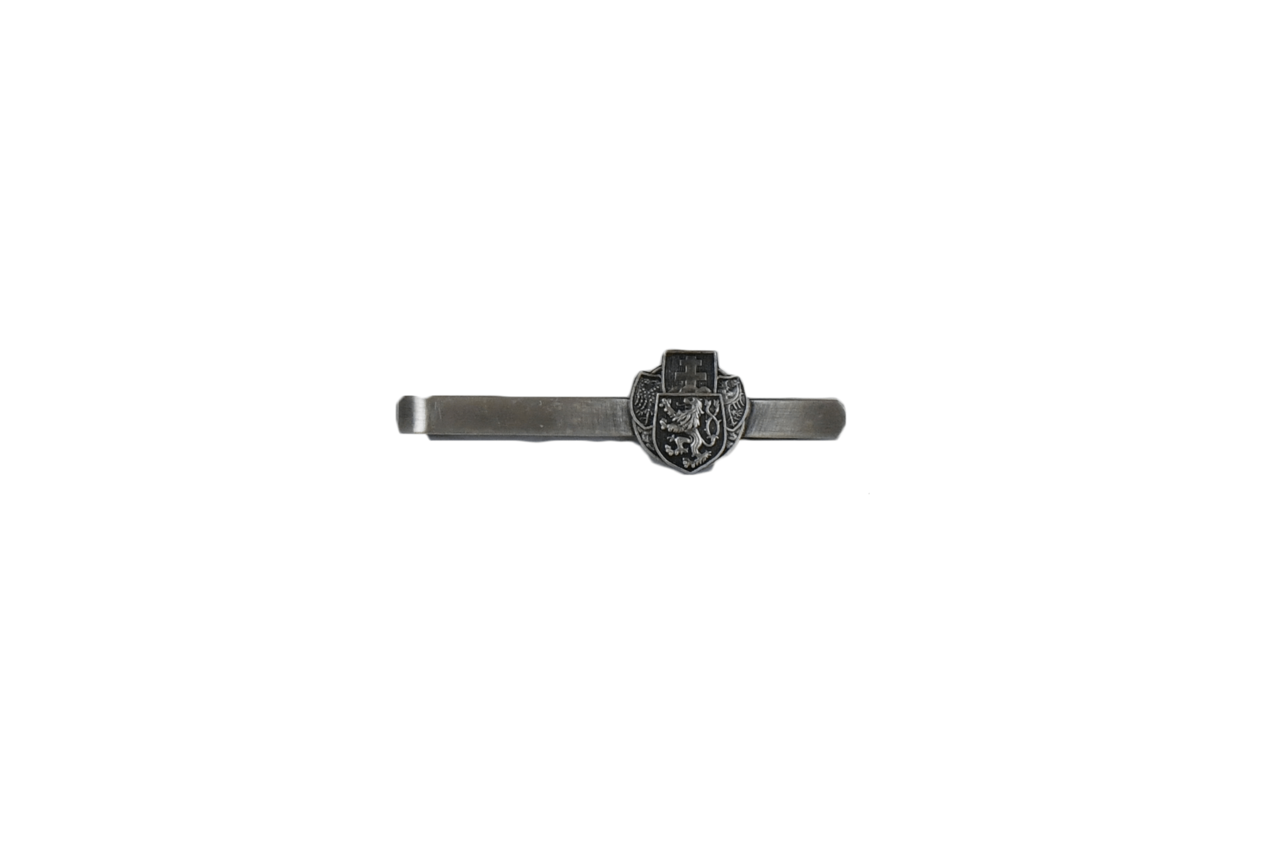 Kravatová spona s klopový odznak v barvě starostříbro. Rozměr: délka spony 63 mm, šířka sdruženého odznaku 16 mm, výška 17 mm.