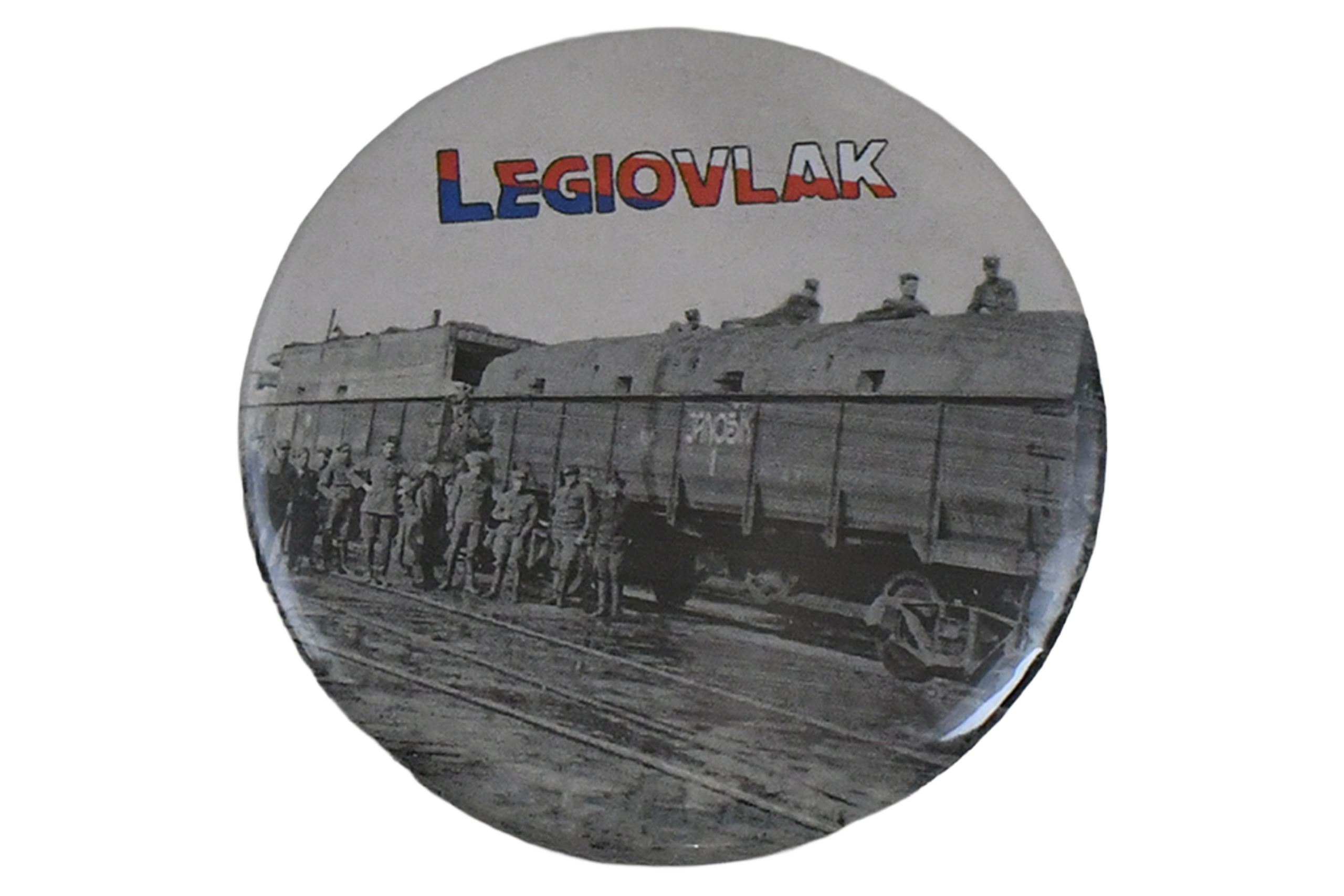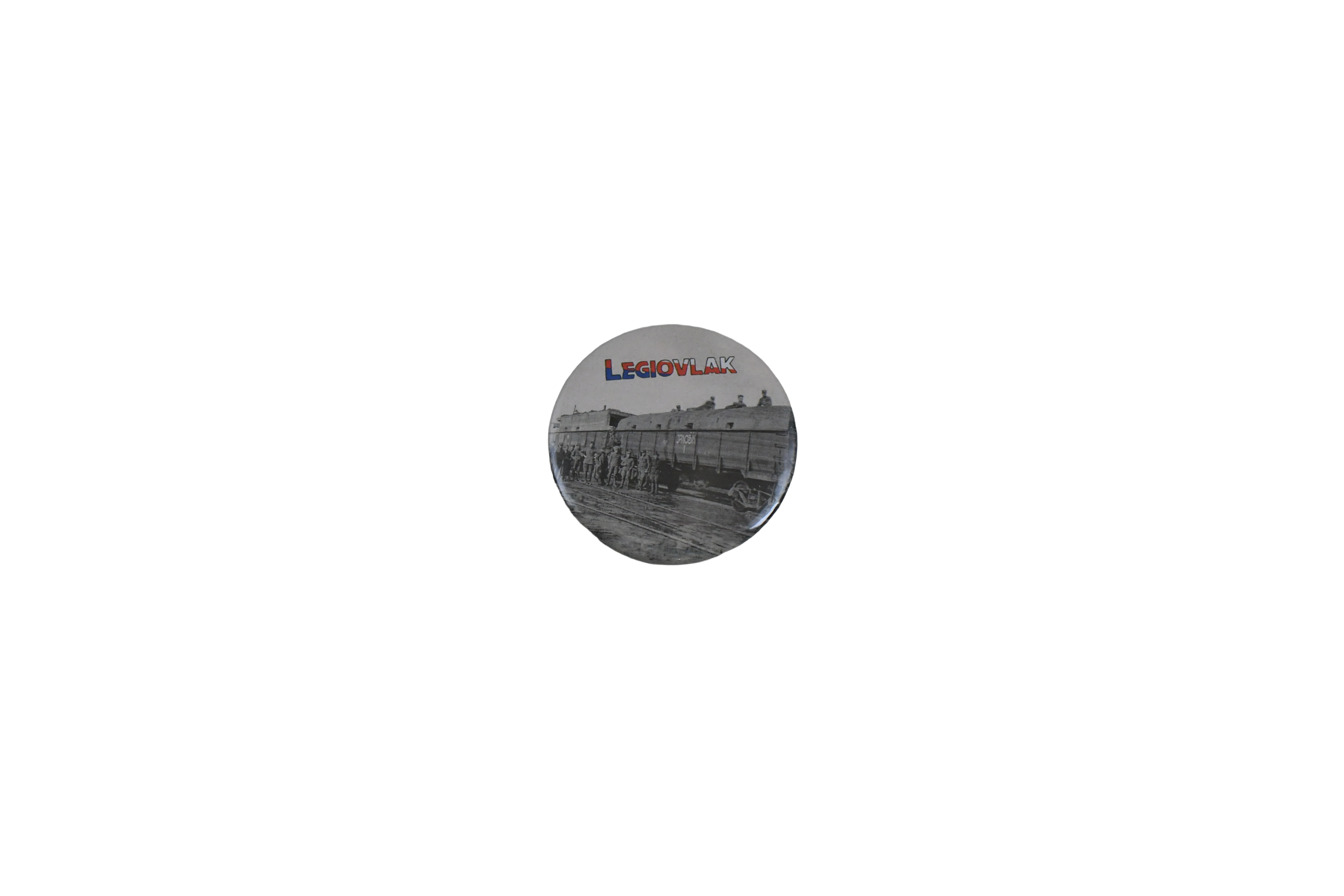 Magnet s legionářským motivem a nápisem Legiovlak v trikoloře. Plnobarevný tisk, přední strana je překrytá lesklou průsvitnou ochrannou fólií. Vlastní výroba. Rozměr buttonu: 56 mm.