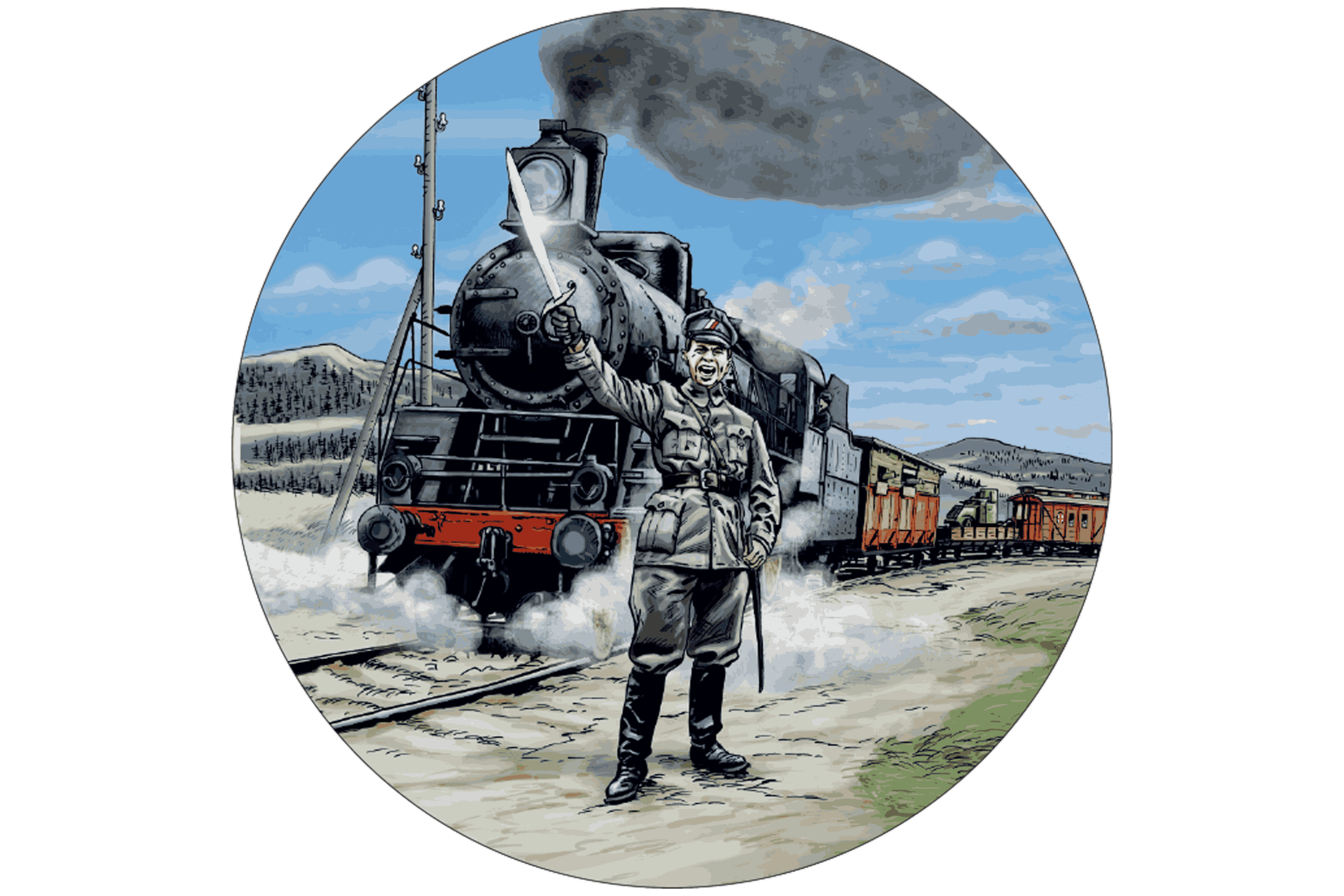 Magnetka s legionářským motivem odkazujícím na pojízdné muzeum ČsOL Legiovlak. Plnobarevný tisk, přední strana je překrytá lesklou průsvitnou ochrannou fólií. Vlastní výroba. Rozměr buttonu: 37 mm. Původní motiv převzat z časopisu ABC – © CZECH NEWS CENTER a.s.