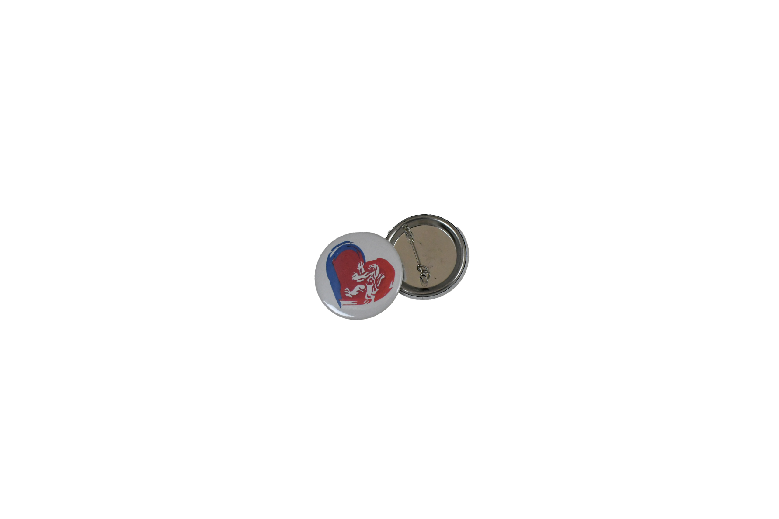 Placka na spínací špendlík s motivem českého lva v srdci. Plnobarevný tisk, přední strana je překrytá lesklou průsvitnou ochrannou fólií. Vlastní výroba. Rozměr buttonu: 37 mm.