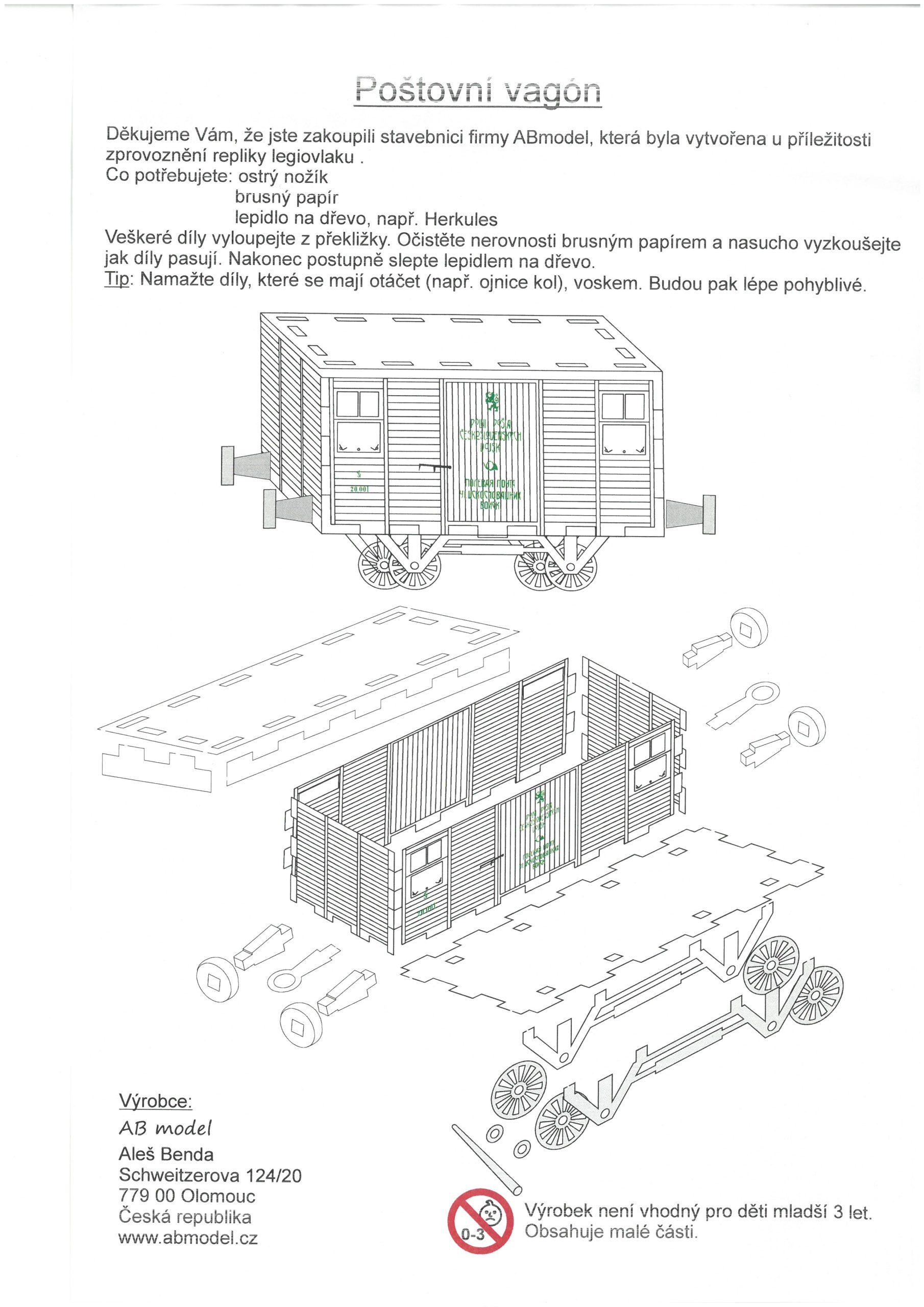 Model vagonu polní pošty, vypálený z překližky do formy stavebnice. Model je potřeba slepit lepidlem na dřevo (např. Herkules), které není součástí balení. Balení obsahuje jednoduchý návod ke složení.