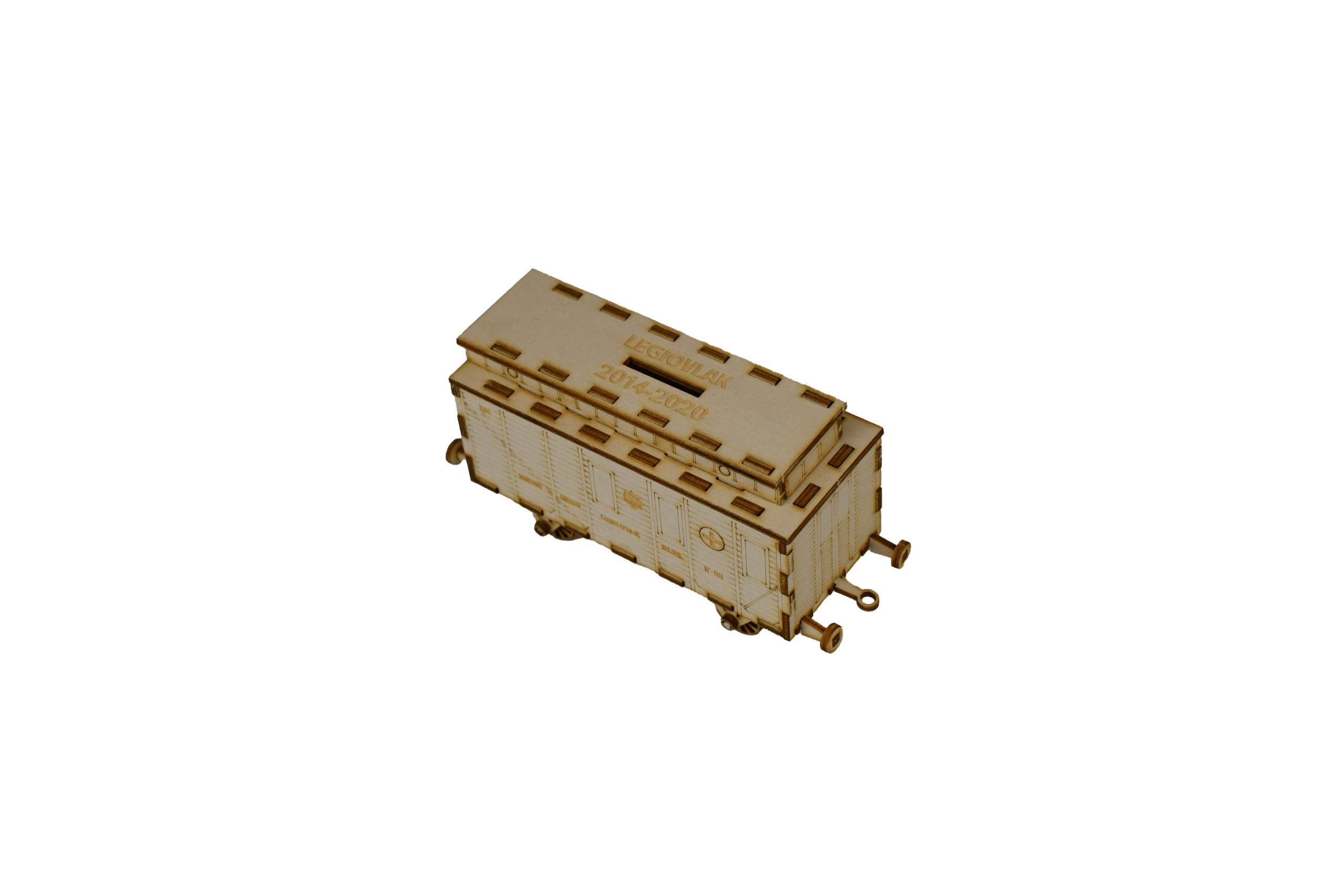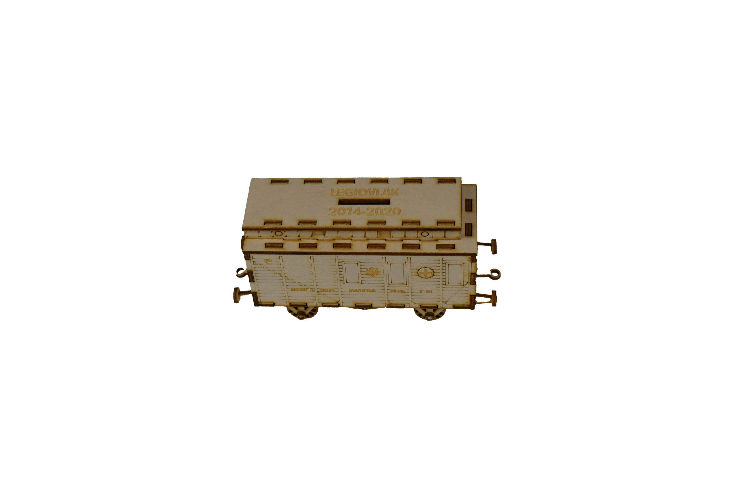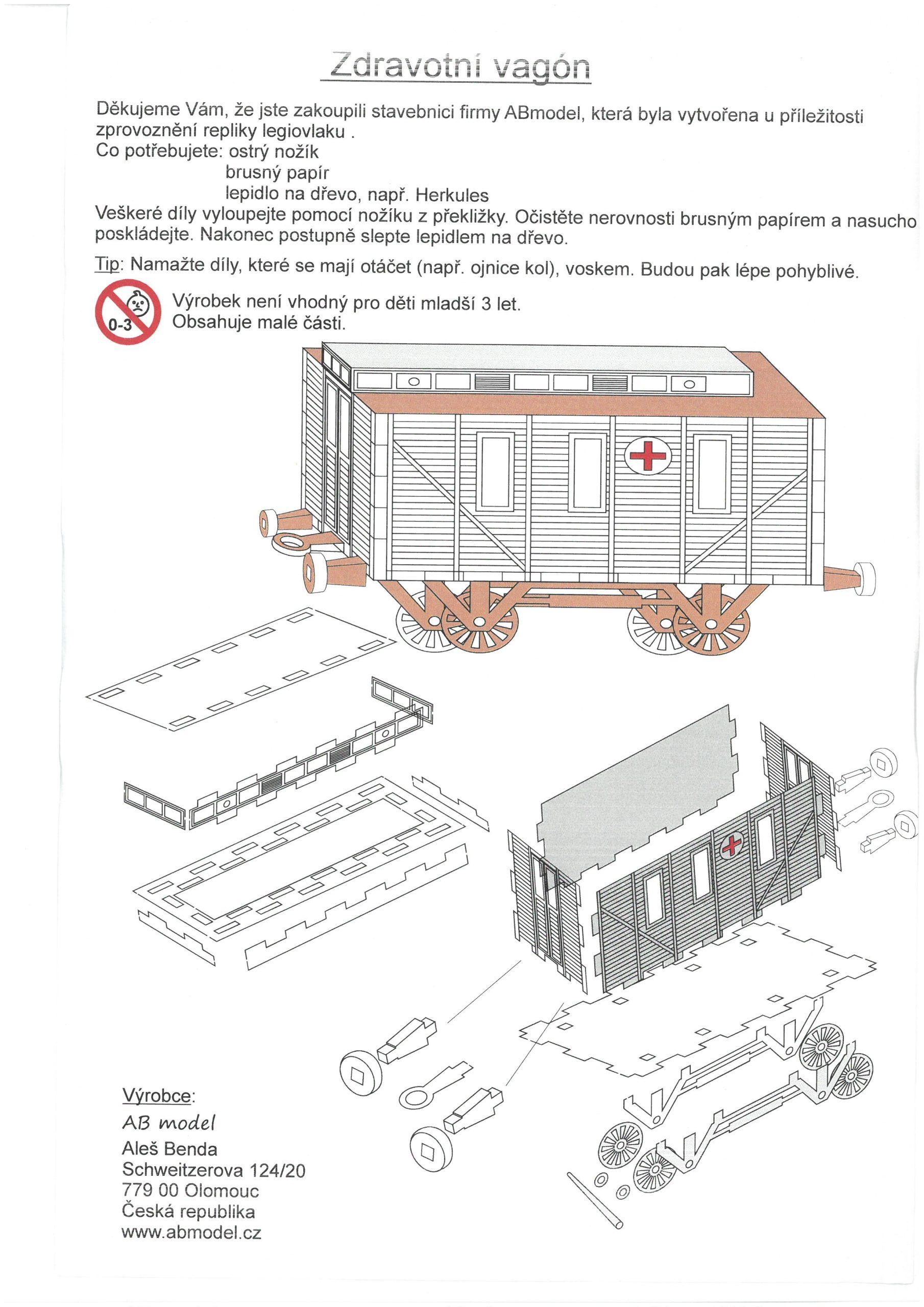 Model zdravotního vagonu, vypálený z překližky do formy stavebnice. Model je potřeba slepit lepidlem na dřevo (např. Herkules), které není součástí balení. Balení obsahuje jednoduchý návod ke složení.