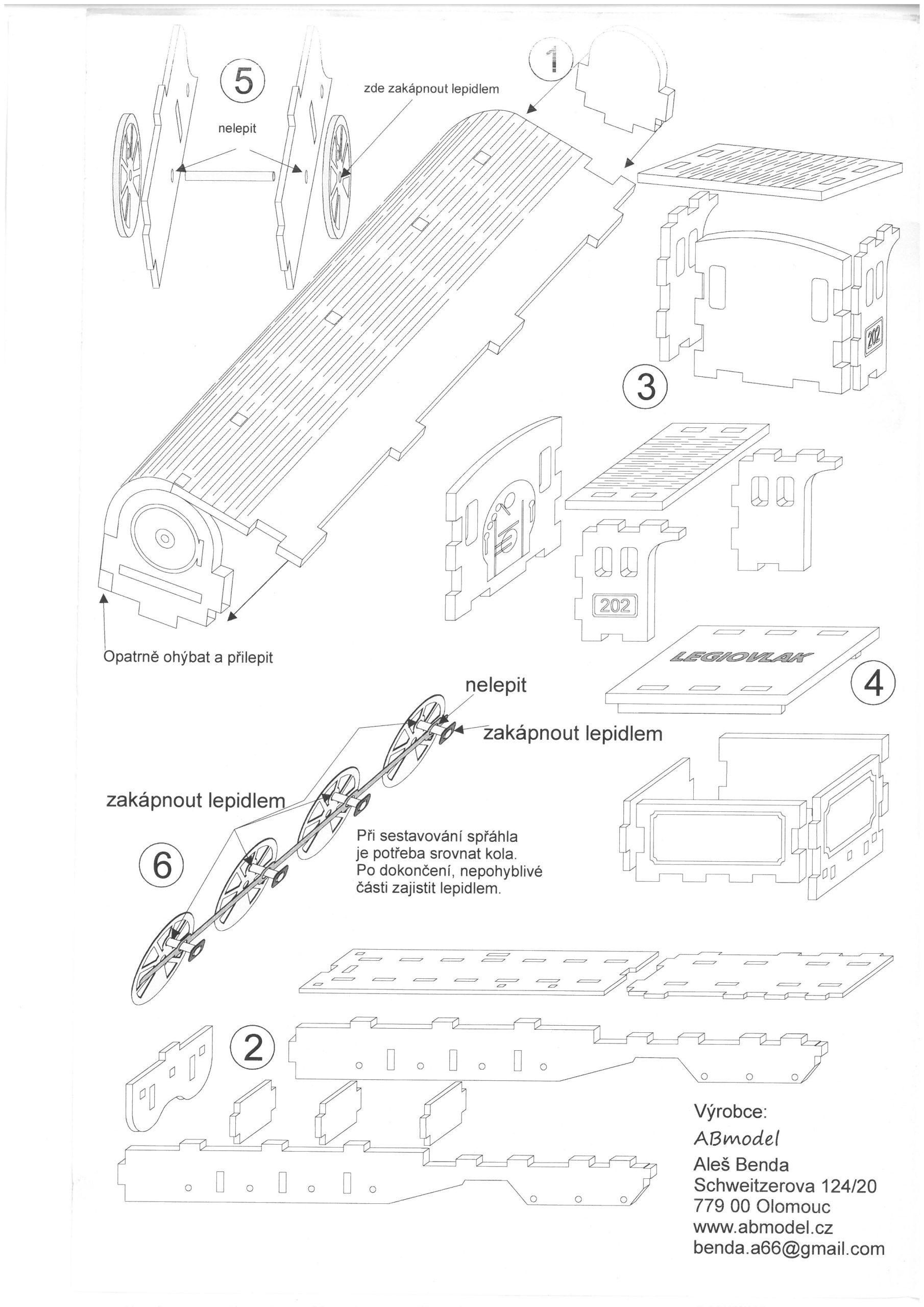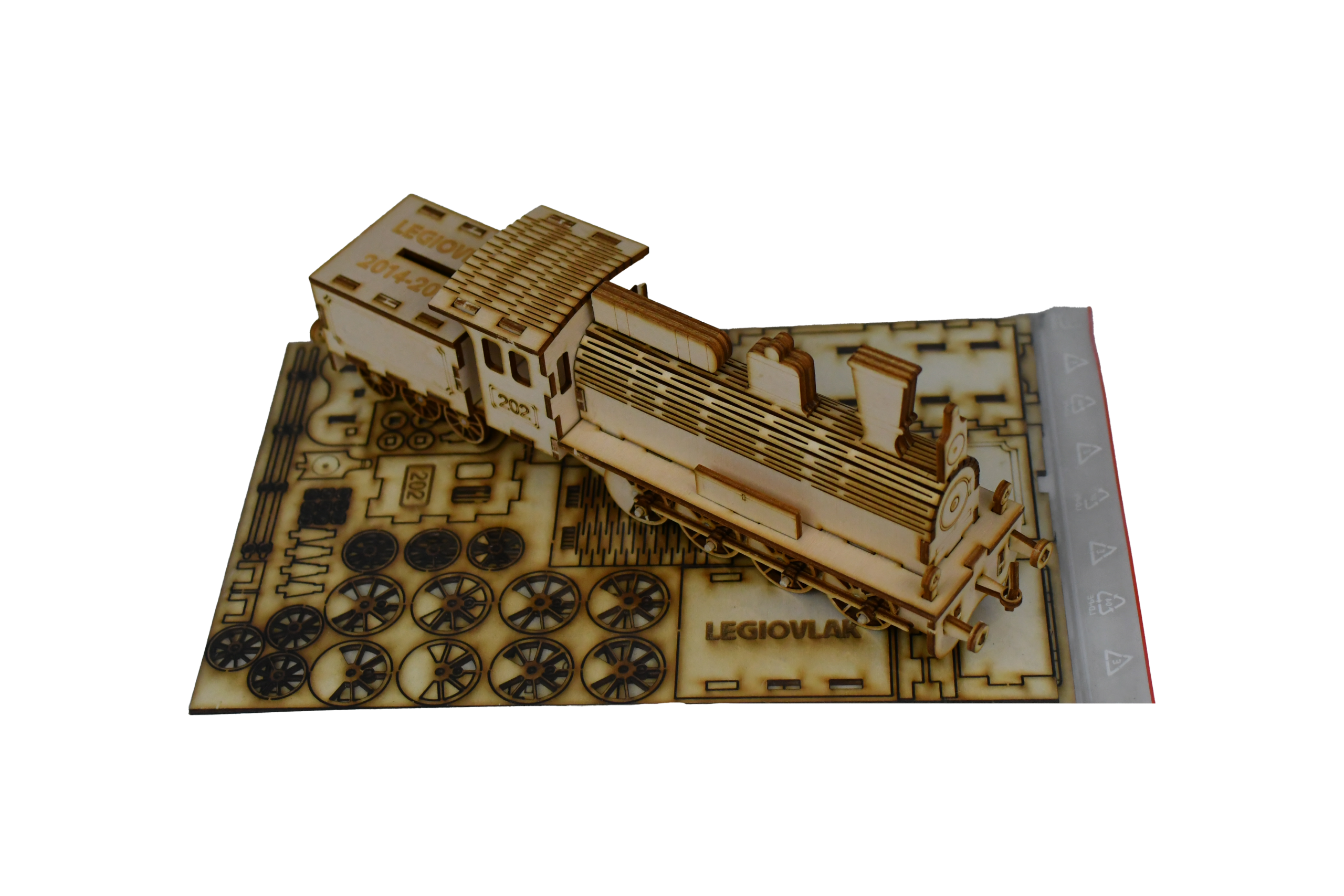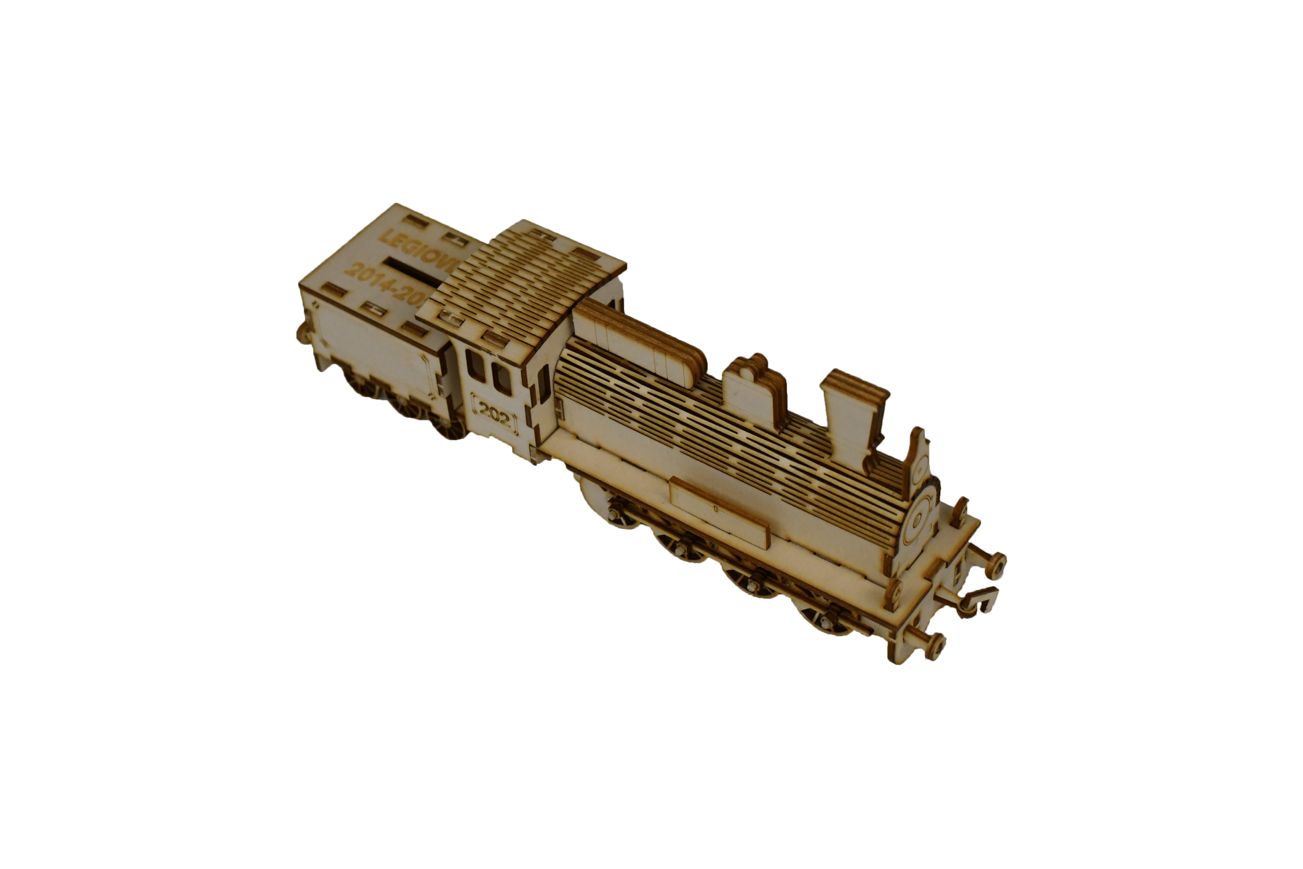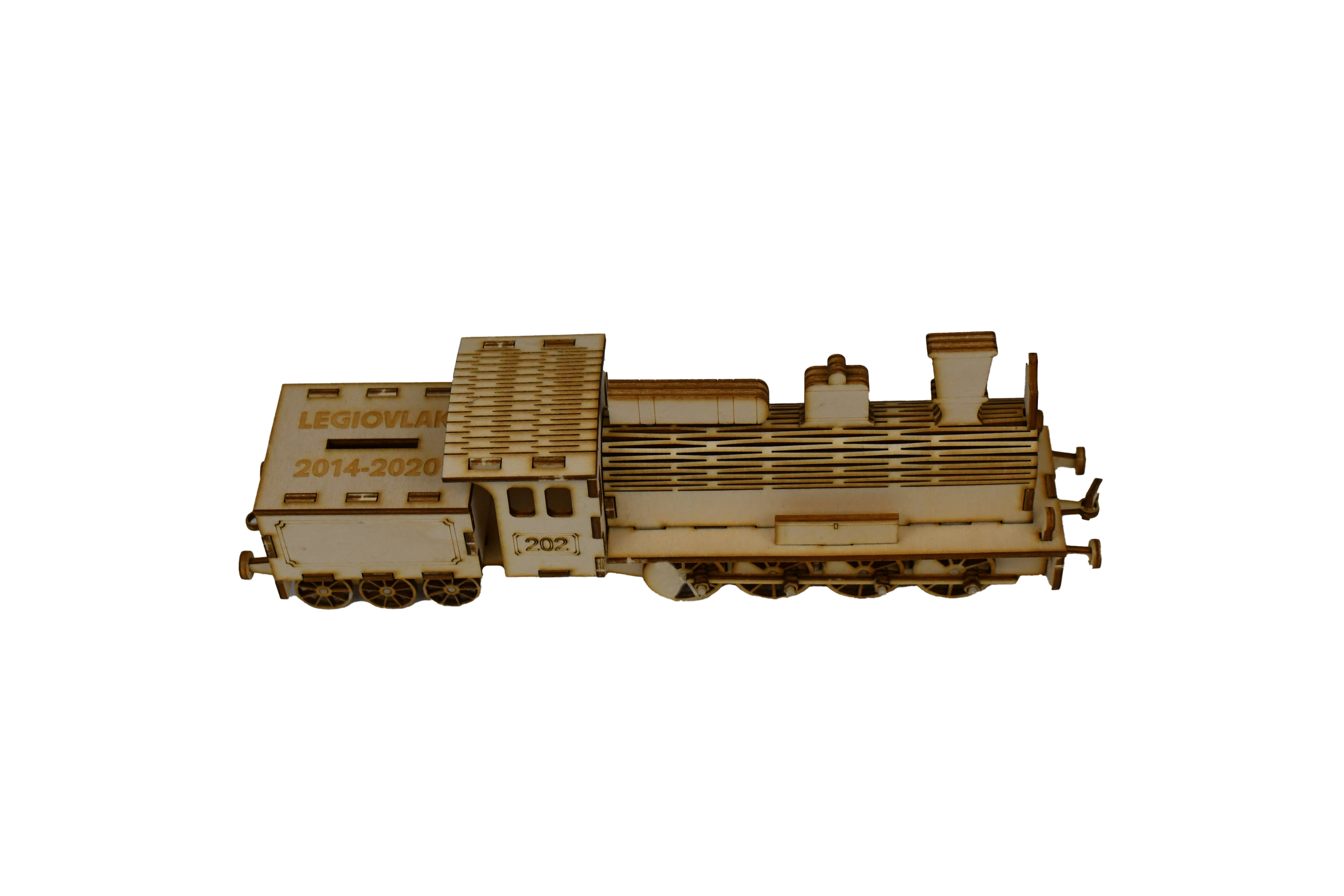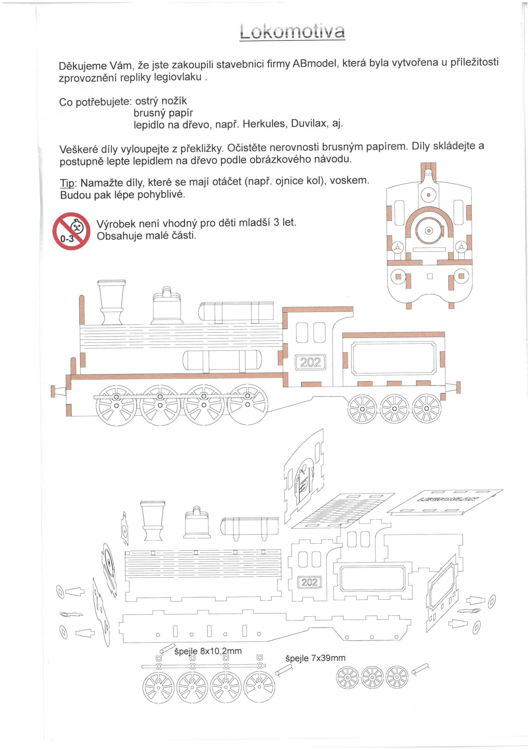 Model lokomotivy, vypálený z překližky do formy stavebnice. Model je potřeba slepit lepidlem na dřevo (např. Herkules), které není součástí balení. Balení obsahuje jednoduchý návod ke složení.