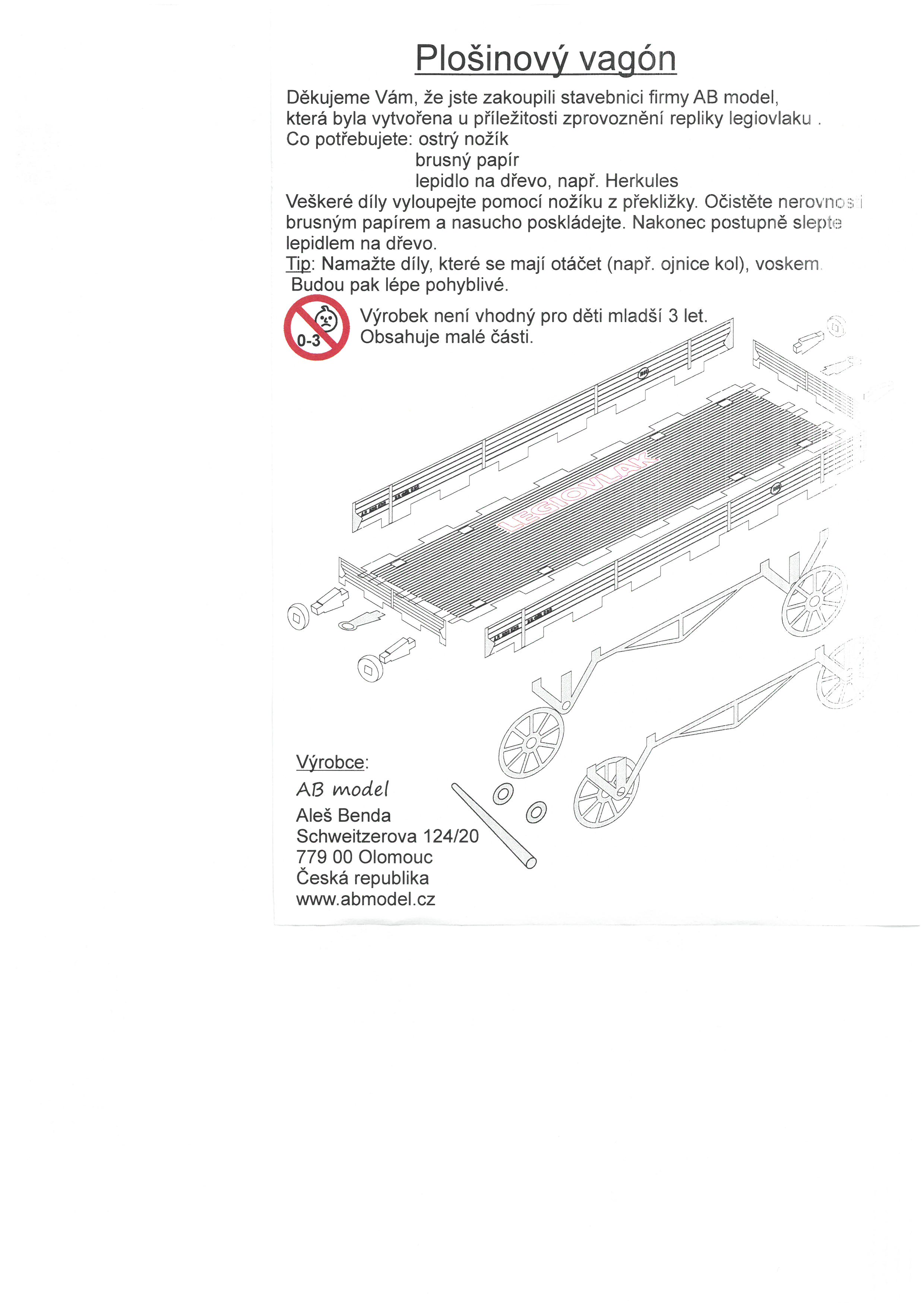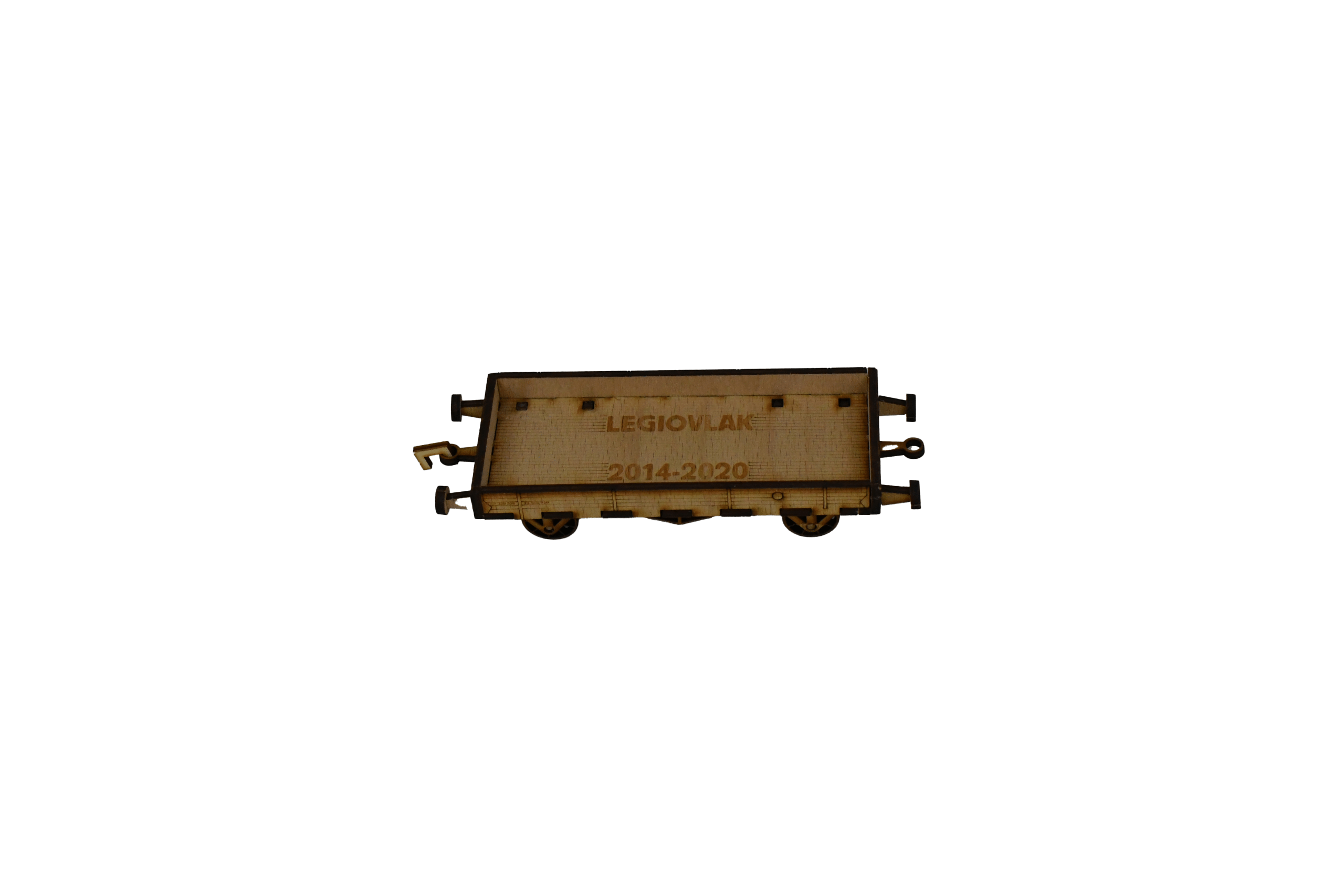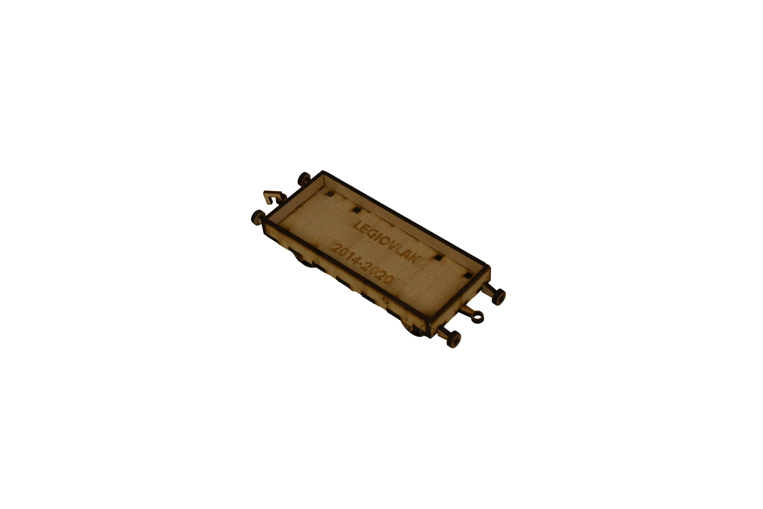 Model plošinového vagonu, vypálený z překližky do formy stavebnice. Model je potřeba slepit lepidlem na dřevo (např. Herkules), které není součástí balení. Balení obsahuje jednoduchý návod ke složení.