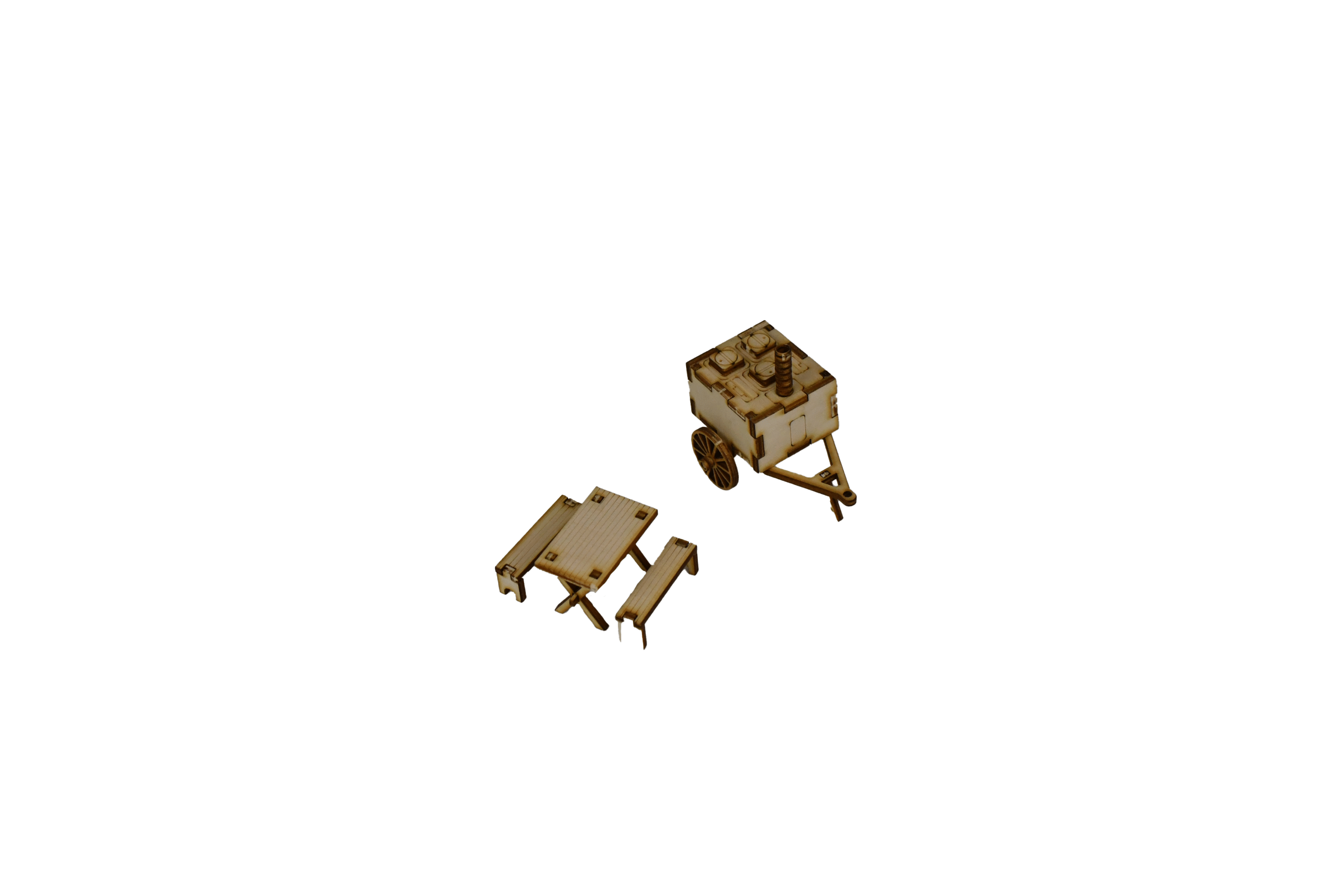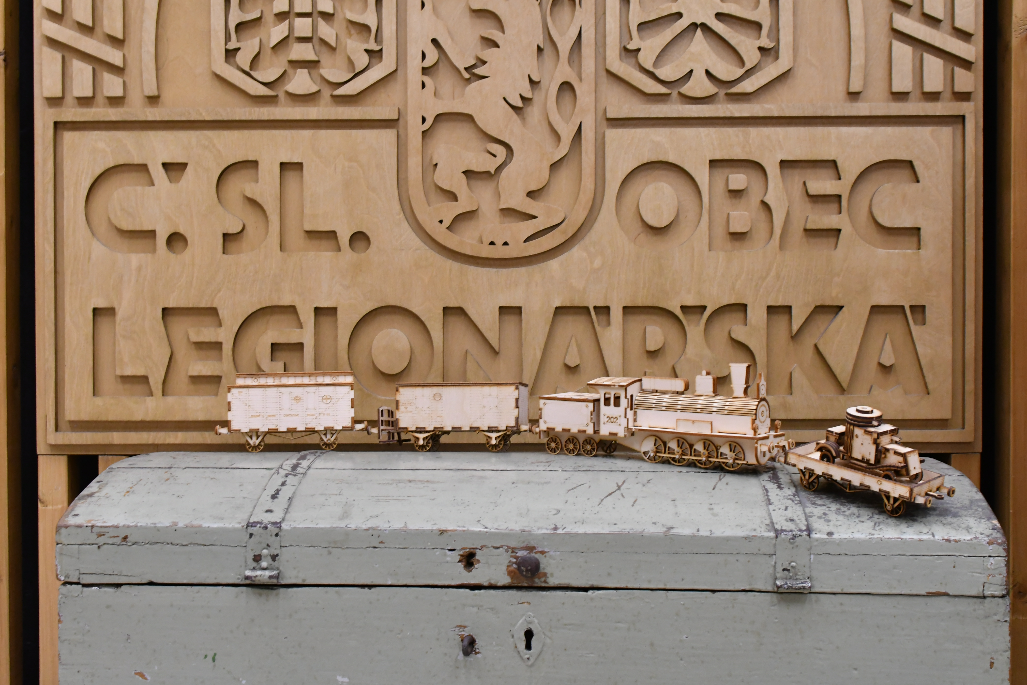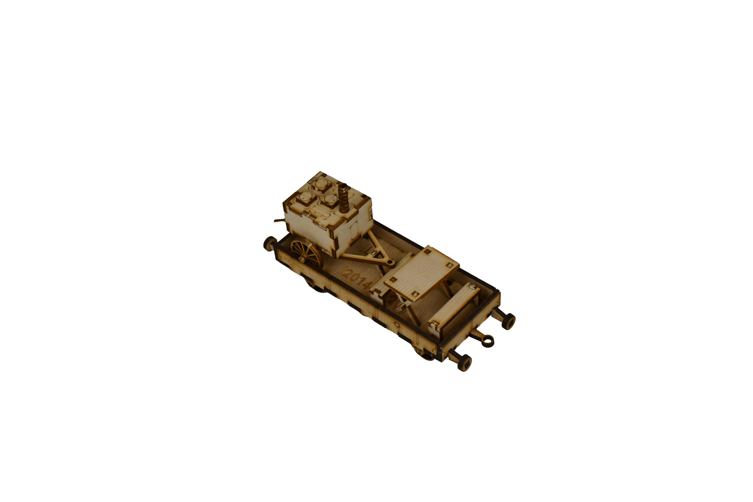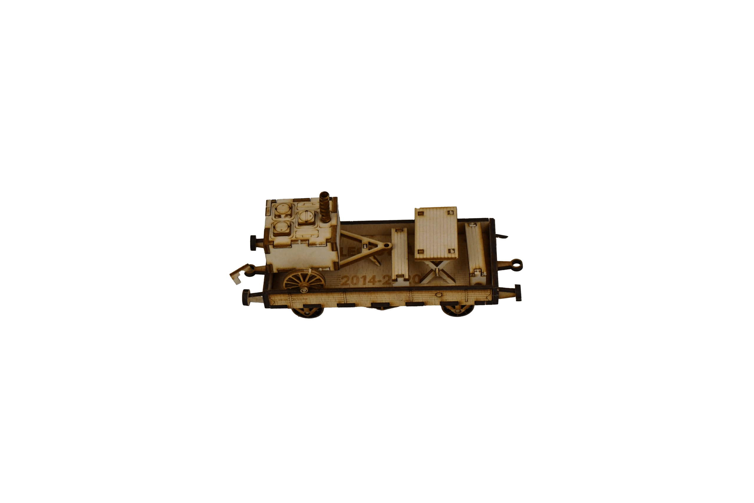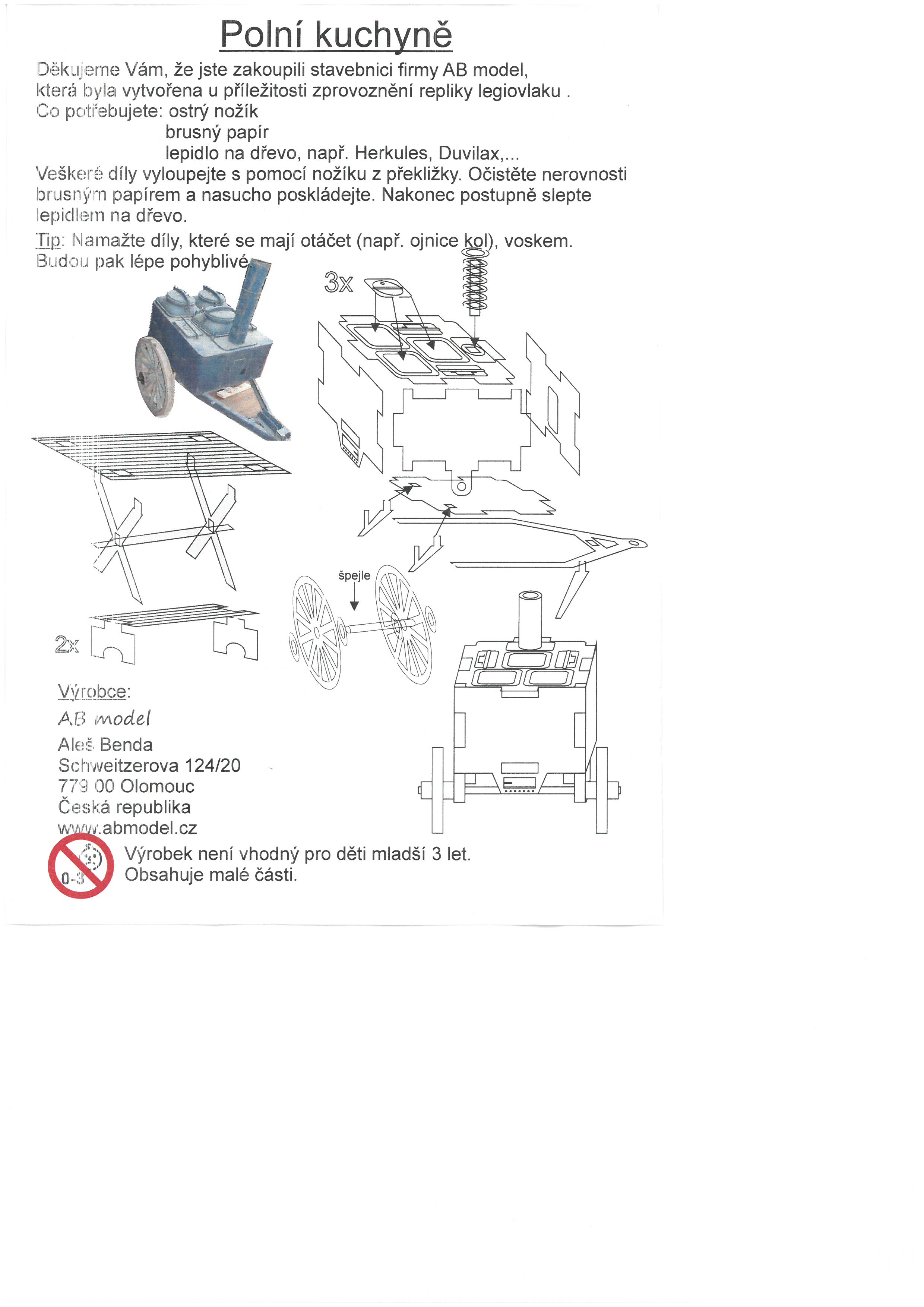 Model polní kuchyně, vypálený z překližky do formy stavebnice. Model je potřeba slepit lepidlem na dřevo (např. Herkules), které není součástí balení. Sestavený model se umisťuje na stavebnici „plošinový vagon“. Balení obsahuje jednoduchý návod ke složení.